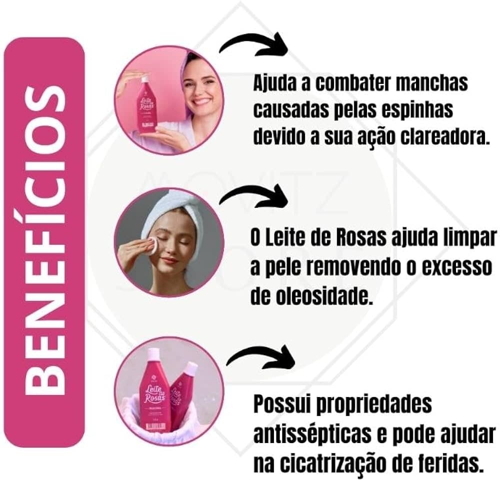 O Tônico Leite de Rosas é uma loção desodorante com ação adstringente, indicado para a limpeza da pele, principalmente do rosto.