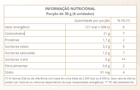 Farinha de trigo enriquecida com ferro e ácido fólico, açúcar, farinha de milho enriquecida com ferro e ácido fólico, gordura vegetal, açúcar invertido, amido, sal, fermentos químicos bicarbonato de amônio e bicarbonato de sódio, emulsificante lecitina de soja, aromatizante e acidulante ácido láctico.