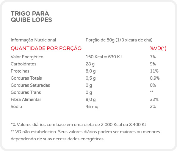 A peça chave para um prato apetitoso e no ponto certo é o Trigo para Kibe Lopes, que pode ser usado em diversas receitas como kibes crus, fritos e assados, saladas e muito mais. O trigo para kibe da Lopes é o próprio grão do trigo integral, cozido, moídoUtilidade: